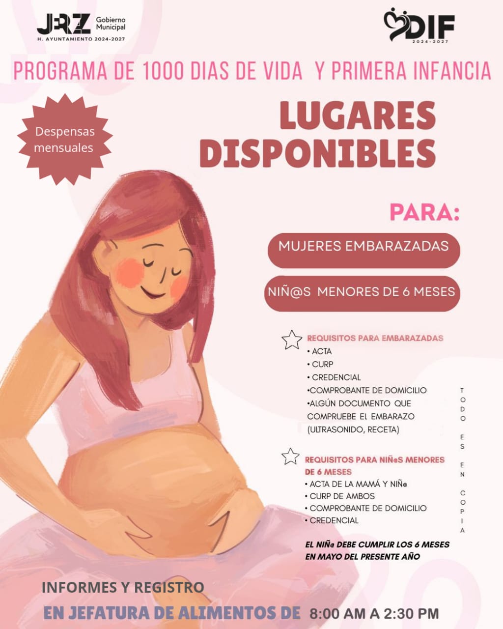 El DIF de Jerez abre el registro al Programa Mil Días de Vida y Primera Infancia, dirigido a mujeres embarazadas o madres con bebés de entre 0 y 6 meses de edad cumplidos como máximo en mayo de este año. Las beneficiarias recibirán despensas mensuales durante un año.