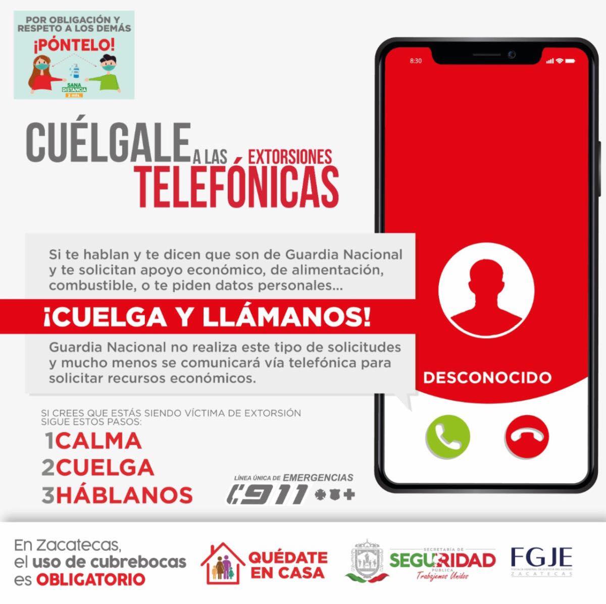 Con base en lo anterior, autoridades de seguridad advirtieron a la población de estas estafas y la invitaron a no caer en el engaño, además de denunciar y utilizar aplicaciones como Zacatecas Libre de Extorsión, a través de la cual se puede alertar sobre números telefónicos que se utilizan para fines ilícitos.