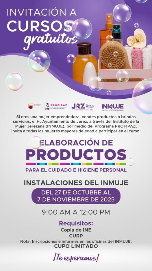 El Instituto de la Mujer Jerezana (INMUJE) del DIF Jerez abrió las inscripciones para el Taller de Elaboración de Productos para el Cuidado e Higiene Personal, dirigido a mujeres mayores de edad emprendedoras que vendan productos o brinden servicios.