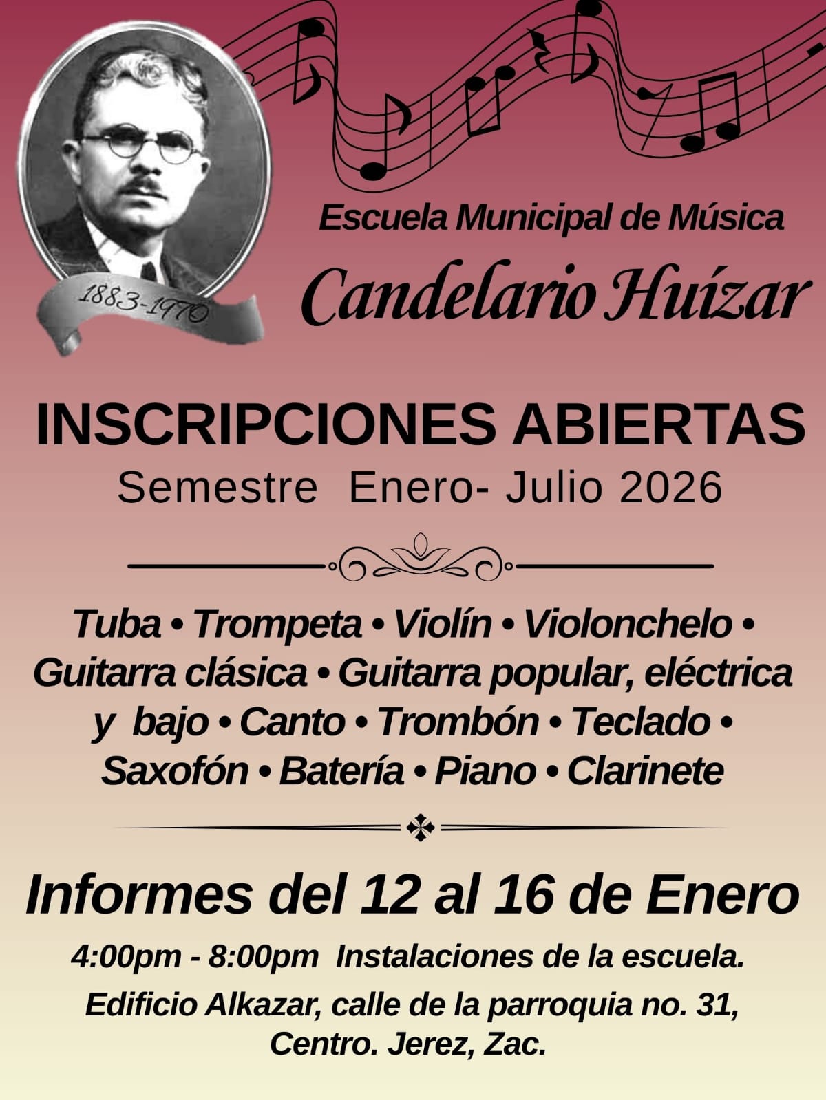 La escuela Municipal de Música Candelario Huizar anuncia la apertura de inscripciones para el semestre enero-julio 2026, invitando a la ciudadanía a integrarse a esta oferta musical.
