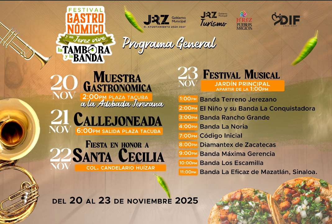 Del 20 al 23 de noviembre, Jerez se convertirá en el escenario de dos grandes eventos que buscan atraer tanto a visitantes como a la comunidad local. Durante estos cuatro días, el Pueblo Mágico ofrecerá una combinación única de gastronomía y música tradicional gracias al Festival Gastronómico y al programa “En Jerez Vive la Tambora y la Banda”, que se desarrollarán de manera simultánea.
