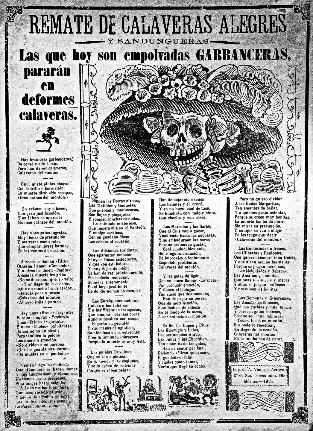 Reproducción de la publicación original de la Calavera Garbancera que vio la luz en 1913; Museo José Guadalupe Posada.
