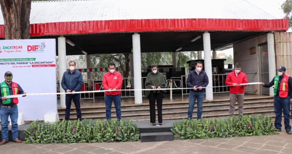 Cristina Rodríguez de Tello, presidenta honorífica del Sistema Estatal para el Desarrollo Integral de la Familia (SEDIF), acompañada por Jorge Peralta Sánchez, gerente de Relaciones Gubernamentales de Grupo México Transportes (Ferromex), hizo entrega de la obra de rehabilitación del trenecito del Parque y Zoológico La Encantada.